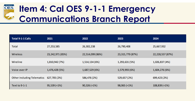 Source: Cal OES 9‑1‑1 Emergency Communications Branch Report, California State 9‑1‑1 Advisory Board meeting, May 14, 2025.