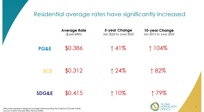 The Public Advocates Office represents utility customers’ interests primarily by participating in proceedings before the California Public Utilities Commission and engaging in other policymaking forums. The California electric utilities recover their operational and investment costs through the rates they charge their customers. These rates regularly change due to many factors. We track the rates and develop recommendations to minimize costs to ratepayers. This report summarizes residential electric rate changes across Pacific Gas and Electric (PG&E), San Diego Gas & Electric (SDG&E), and Southern California Edison (SCE) service territories through July 1, 2025.