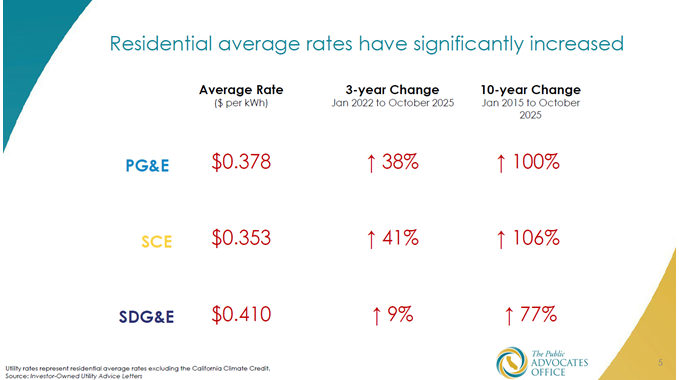 The Public Advocates Office represents utility customers’ interests primarily by participating in proceedings before the California Public Utilities Commission and engaging in other policymaking forums. The California electric utilities recover their operational and investment costs through the rates they charge their customers. These rates regularly change due to many factors. We track the rates and develop recommendations to minimize costs to ratepayers. This report summarizes residential electric rate changes across Pacific Gas and Electric (PG&E), San Diego Gas & Electric (SDG&E), and Southern California Edison (SCE) service territories through October 1, 2025.